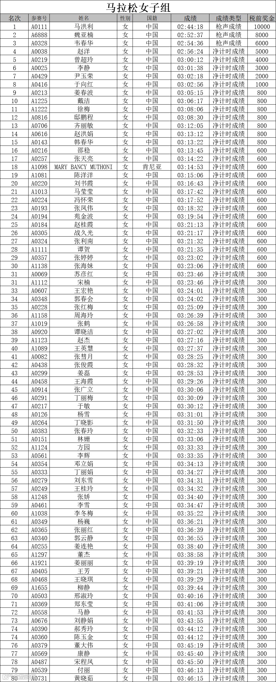 (二)公示期间如无疑议,组委会将在成绩公示结束后10个工作日内通过支付宝或银行转账的形式发放奖金。马拉松男、女前三名获奖运动员奖金须待成绩公示及兴奋剂检测合格后10个工作日内通过转账划拨。