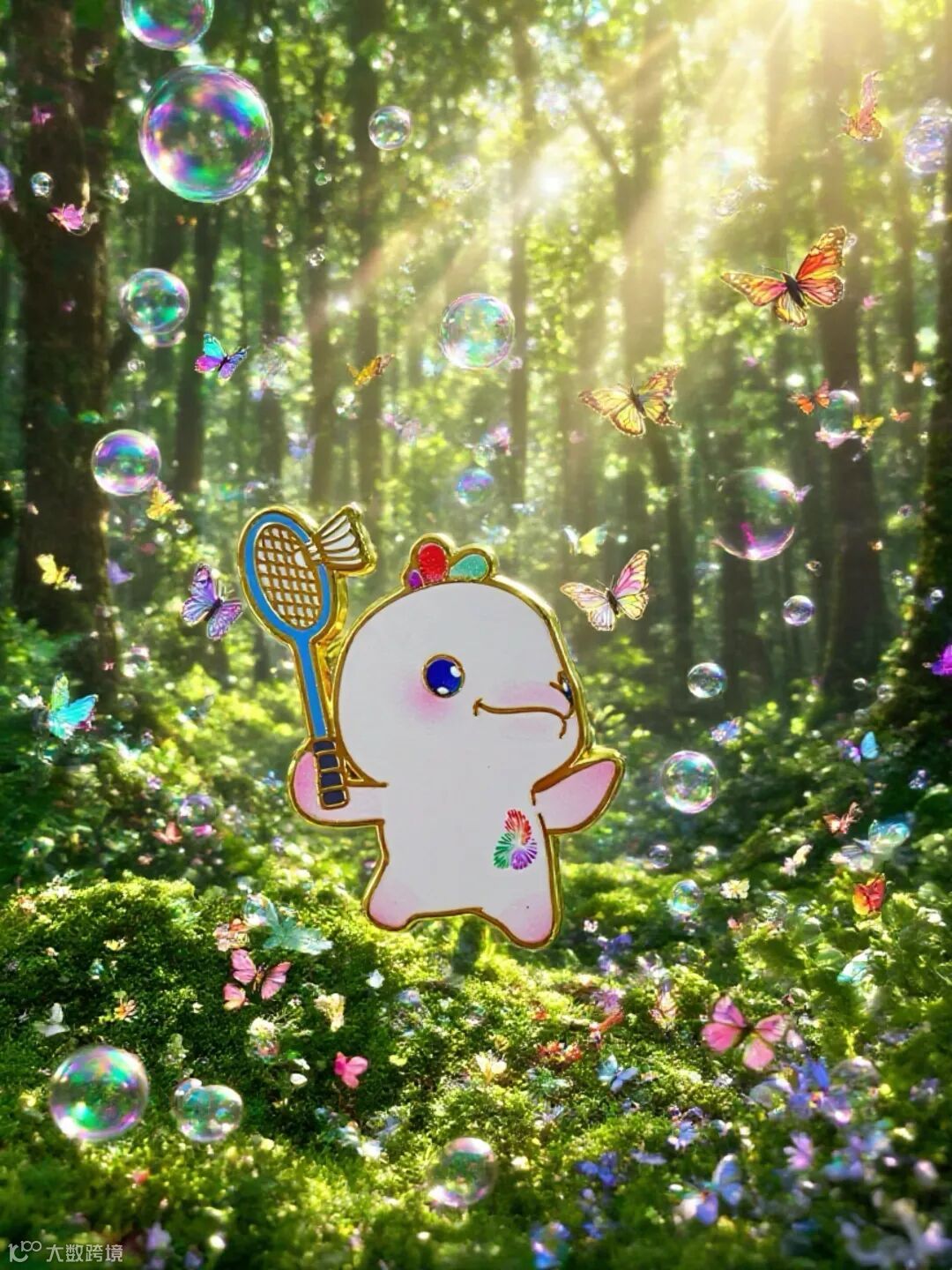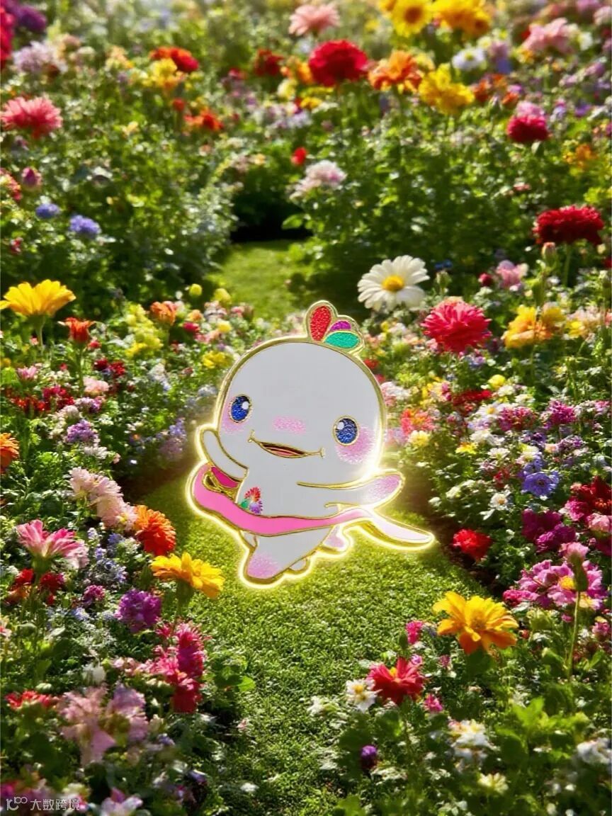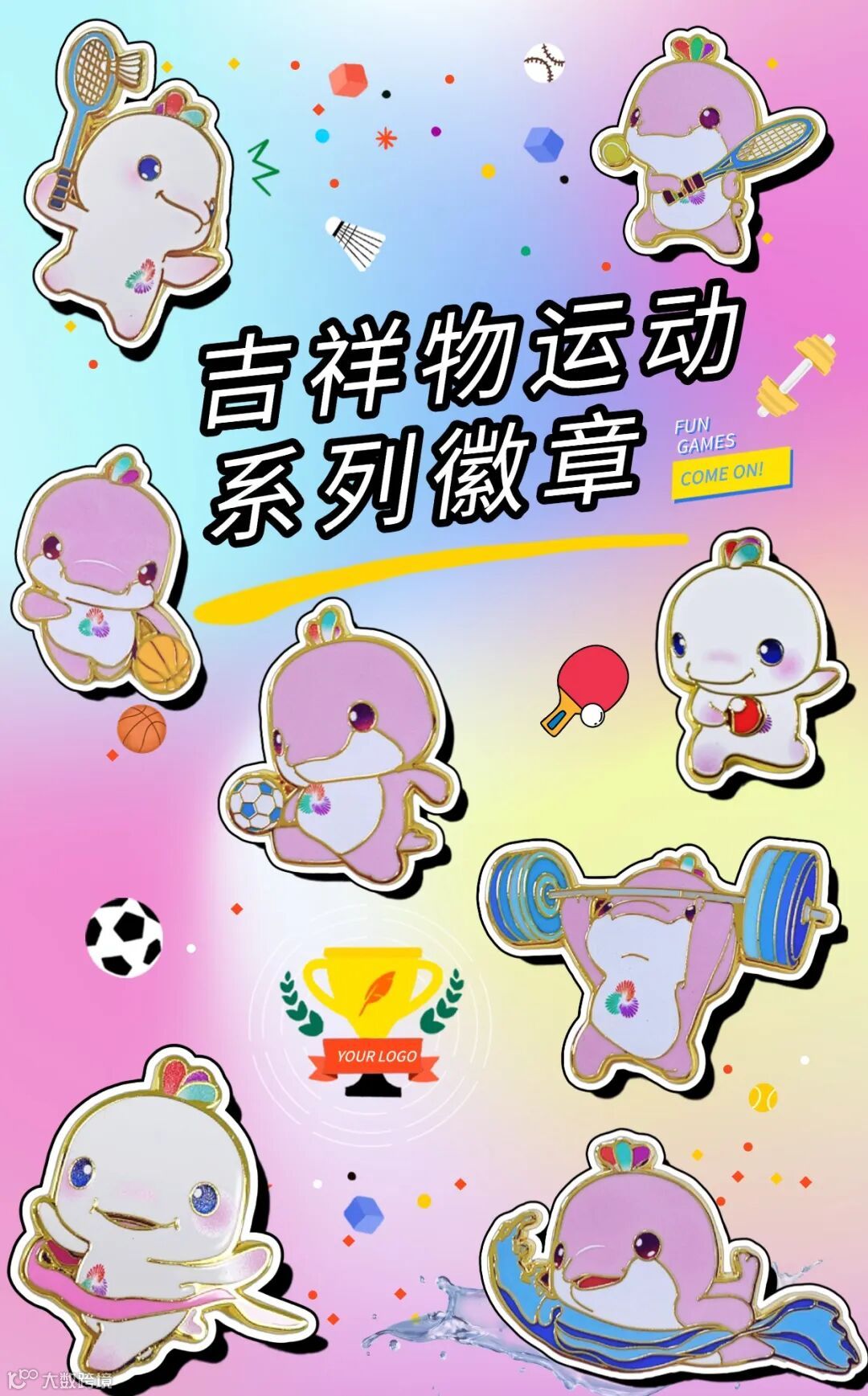 吉祥物运动系列徽章——以中华白海豚吉祥物 "喜洋洋""乐融融" 为载体, 融合粤港澳大湾区特色与体育竞技精神, 呈现竞技项目的动态美学。徽章采用锌合金珐琅点彩工艺。小小徽章载动三地情, 让每个动作定格湾区心跳。