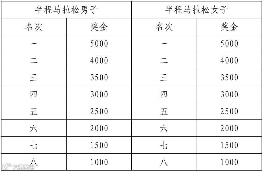 2.半程马拉松:半程马拉松男、女前八名选手,分别获得奖金(人民币,见下表),男、女前三名各发奖杯一座、奖牌一枚。半程马拉松选手名次按净计时成绩进行录取。
