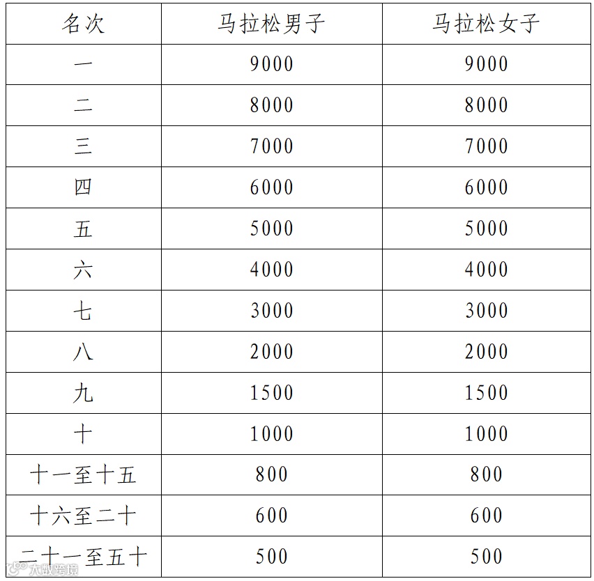 1.马拉松:马拉松男、女前八名选手,分别获得奖金(人民币,见下表),男、女前三名各发奖杯一座、奖牌一枚。马拉松男、女前八名获奖运动员的名次以枪声成绩录取,其他以净计时成绩录取。