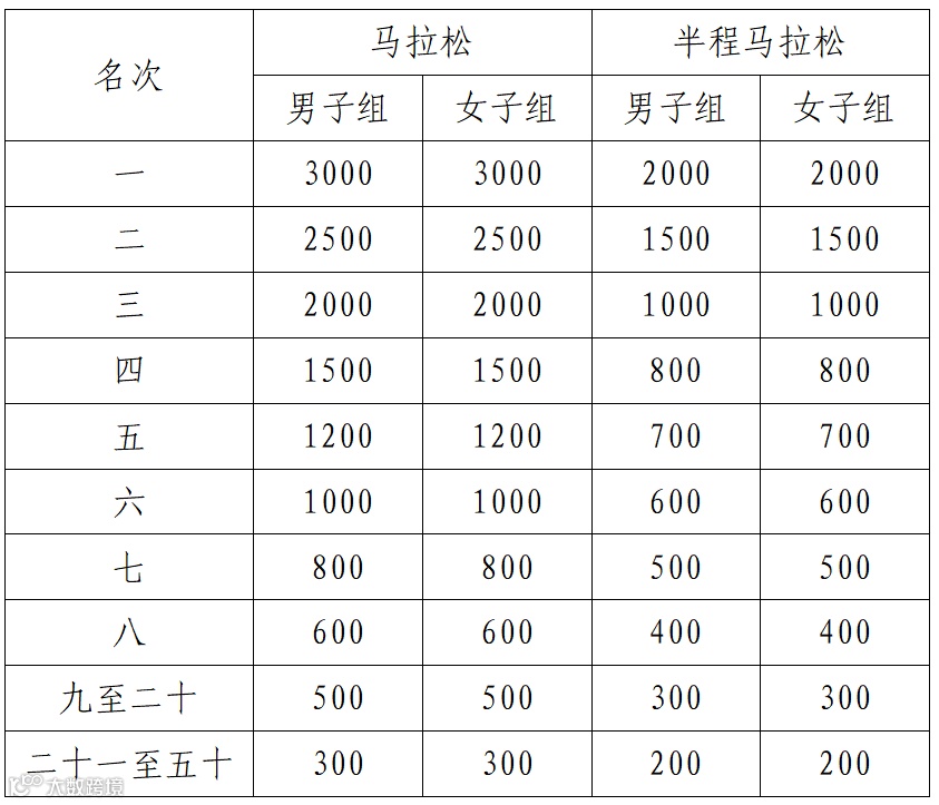 (二)中国籍选手特别奖:凡参加本次比赛马拉松项目的中国籍选手,录取男子和女子前五十名给予奖励,前五十名按净计时成绩进行排名,具体奖金(人民币)如下表。