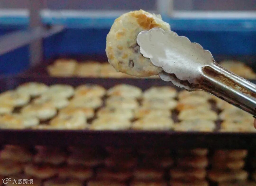 在面团里包裹本地芝麻,配上手工熬制的猪油,将包好馅料的面团轻擀成圆饼状,再将圆饼一个个铺在烤盘里,刷上蛋液添色、撒上芝麻增香,在每个饼上戳出小洞,以便馅料受热膨胀后滋味从里到外蔓延,定时烘烤短短几分钟便可出炉。