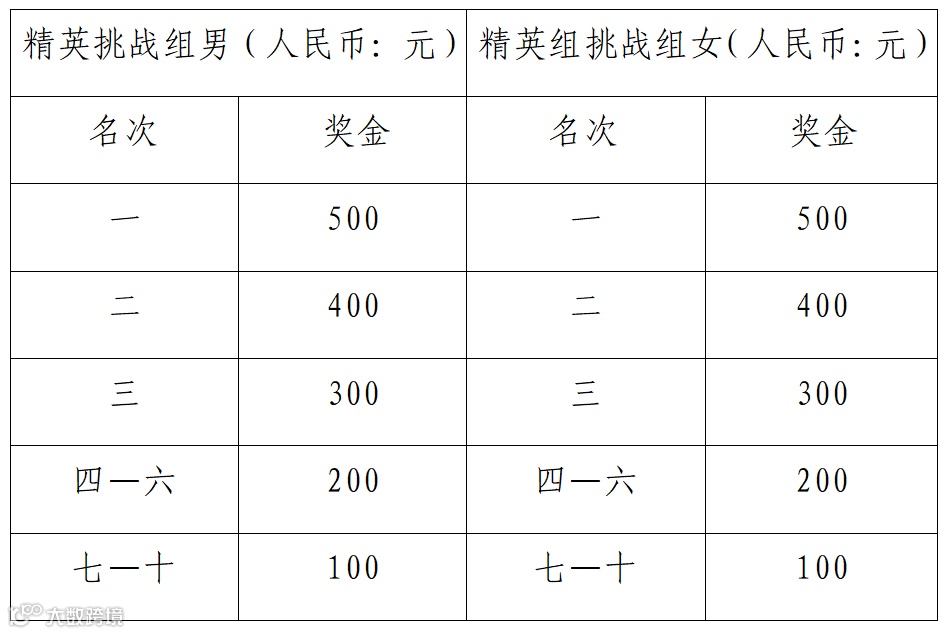 (三)精英挑战组奖金标准如下: