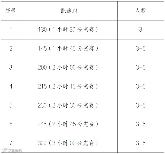(三)有优秀的配速控制能力,要求马拉松300配速组、半程马拉松130配速组成绩高于申请组别成绩10分钟以上;马拉松330及其他半程马拉松配速组成绩高于申请组别成绩15分钟以上;马拉松其他配速组成绩高于申请组别20分钟以上(申请时须上传达到该成绩段内的赛事成绩证明);