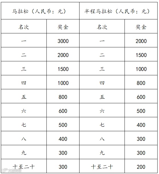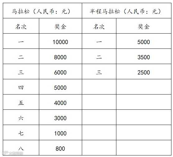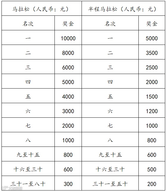 马拉松项目名次奖的男女前八名按照枪声成绩进行排名,其他名次按照净计时成绩进行排名;半程马拉松项目均按照净计时成绩录取名次,具体奖金如下表: