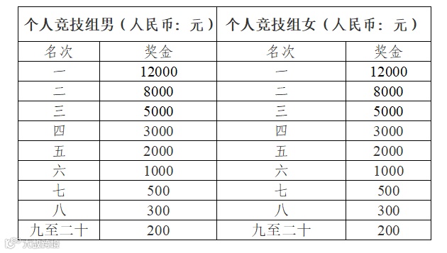 个人竞技组按照枪声计时成绩录取男女前3名,其余名次按照净计时成绩录取,奖励如下: