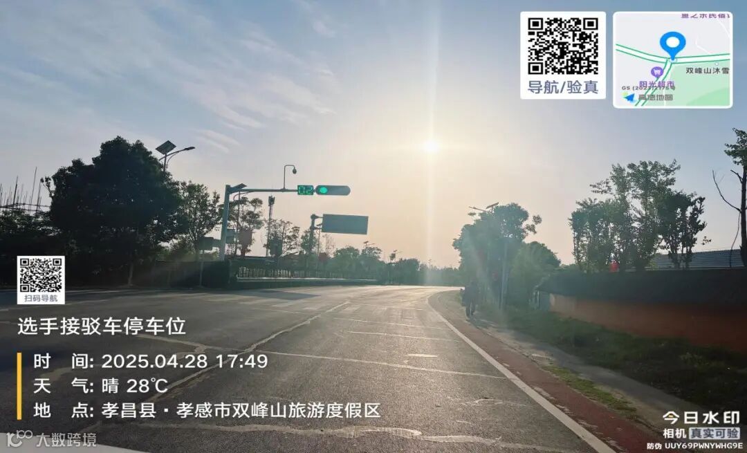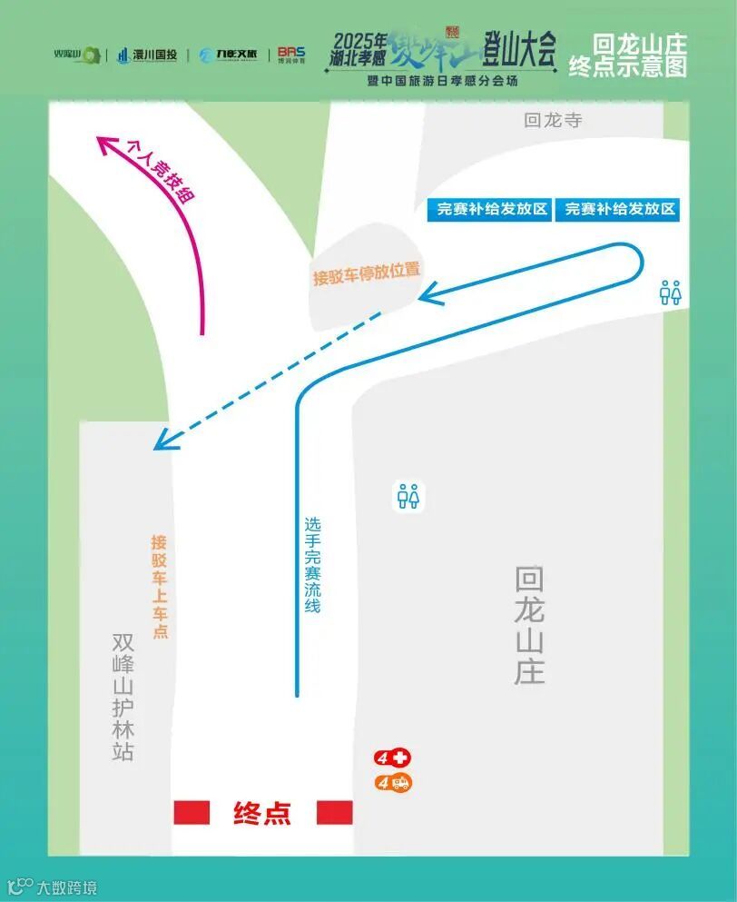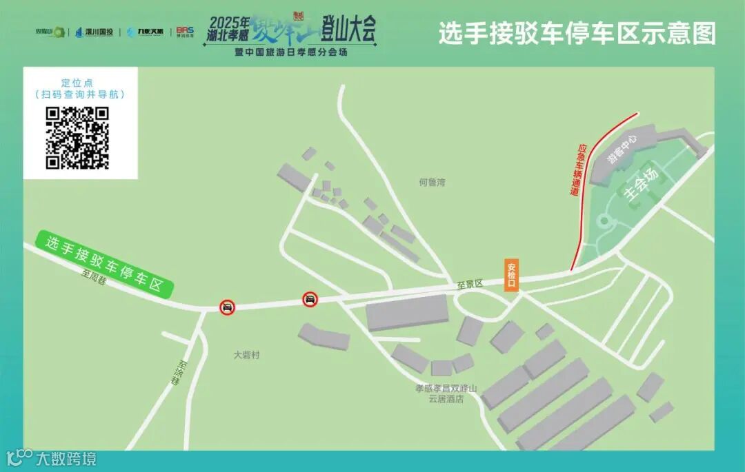 乘坐网约车或亲友送达的参赛选手,可导航至孝感双峰山游客中心,至景区门口红绿灯处下车,根据指引或导航步行至比赛起点。