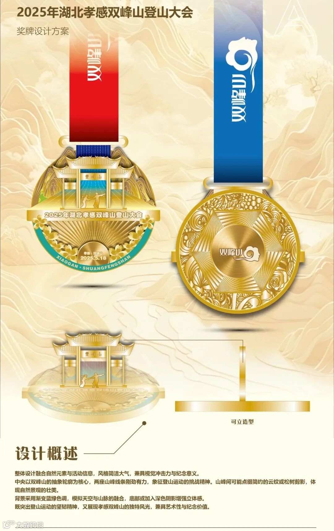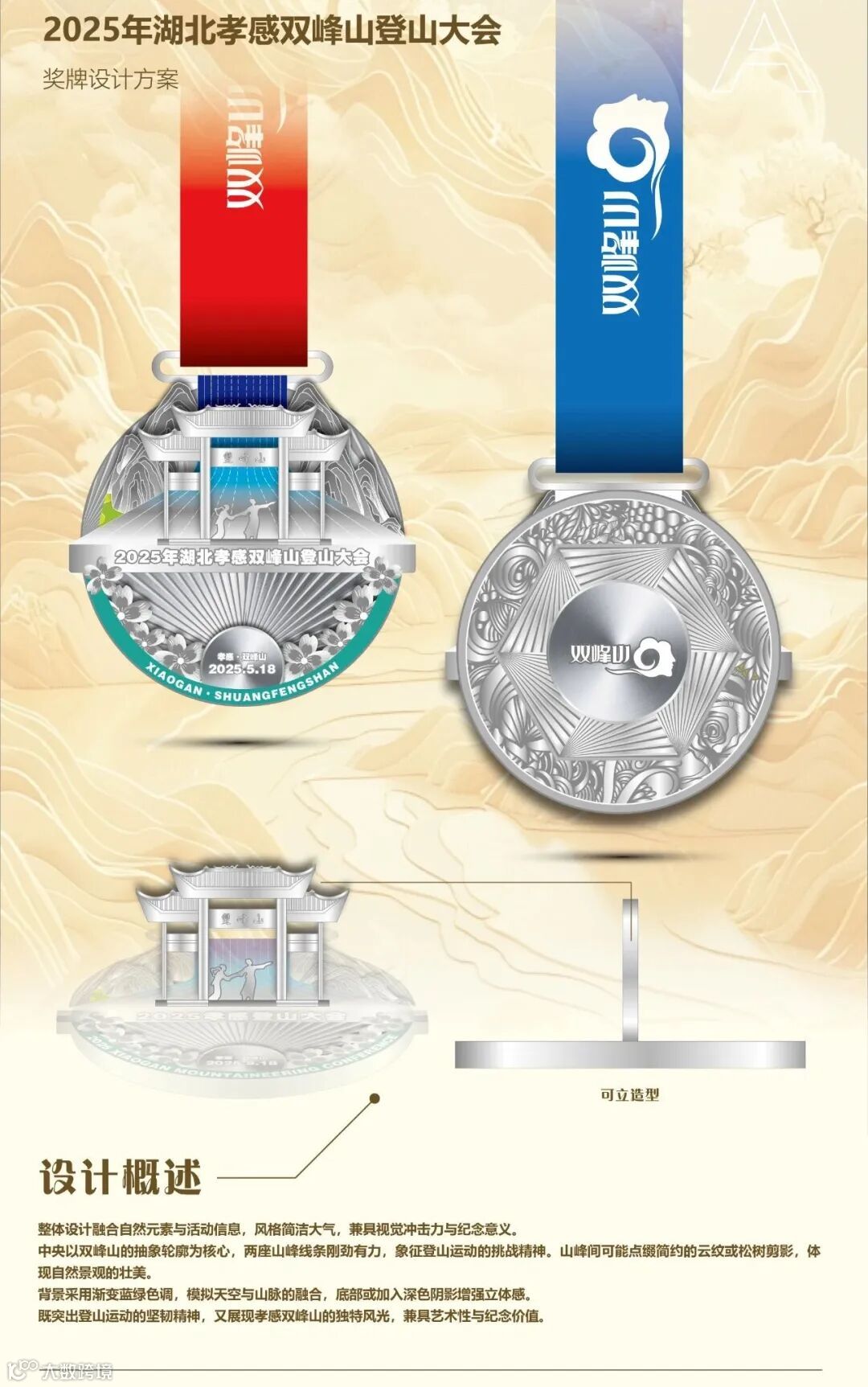 2025年湖北孝感双峰山登山大会完赛奖牌分为两款颜色,个人竞技组完赛奖牌为金色,大众健身组、恩爱情侣组、感恩亲子组为银色。奖牌整体设计融合自然元素与活动信息,风格简洁大气,中间的双峰山为可立造型,兼具视觉冲击力与纪念意义。