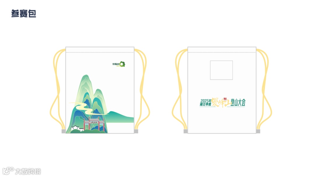 2025年湖北孝感双峰山登山大会参赛包融合双峰山标志性峰峦轮廓,采用水墨笔触呈现层叠山体,搭配动态云雾线条增强空间纵深感。同时,参赛包采用束口袋设计,材质轻盈环保,容量较大,方便参赛者储物、轻装上阵。