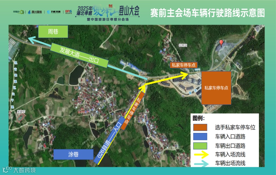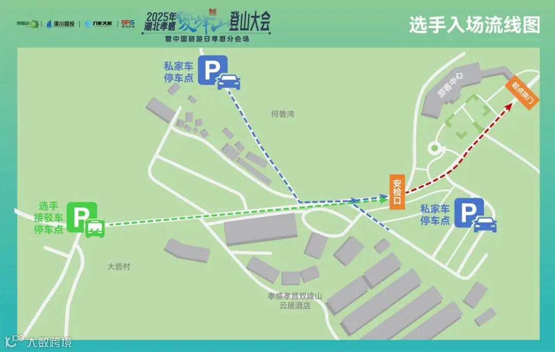 比赛当天,以赛事起点孝感双峰山游客中心为参照,选手主要入场流线如下: