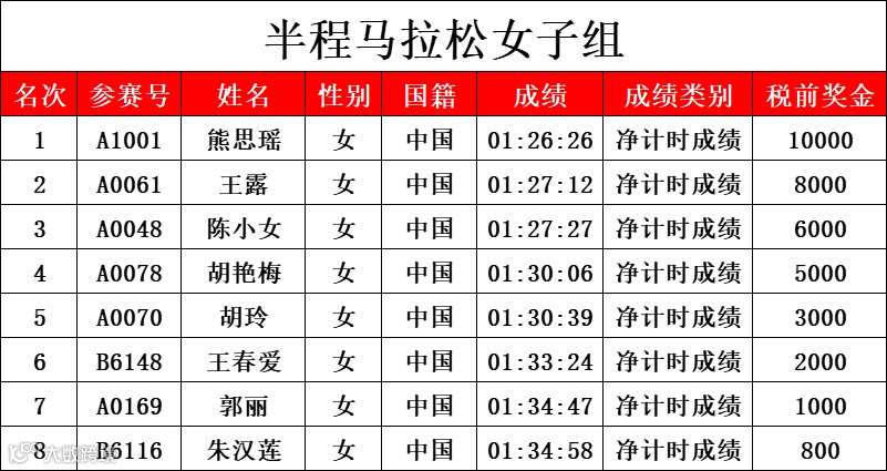半程马拉松项目名次奖