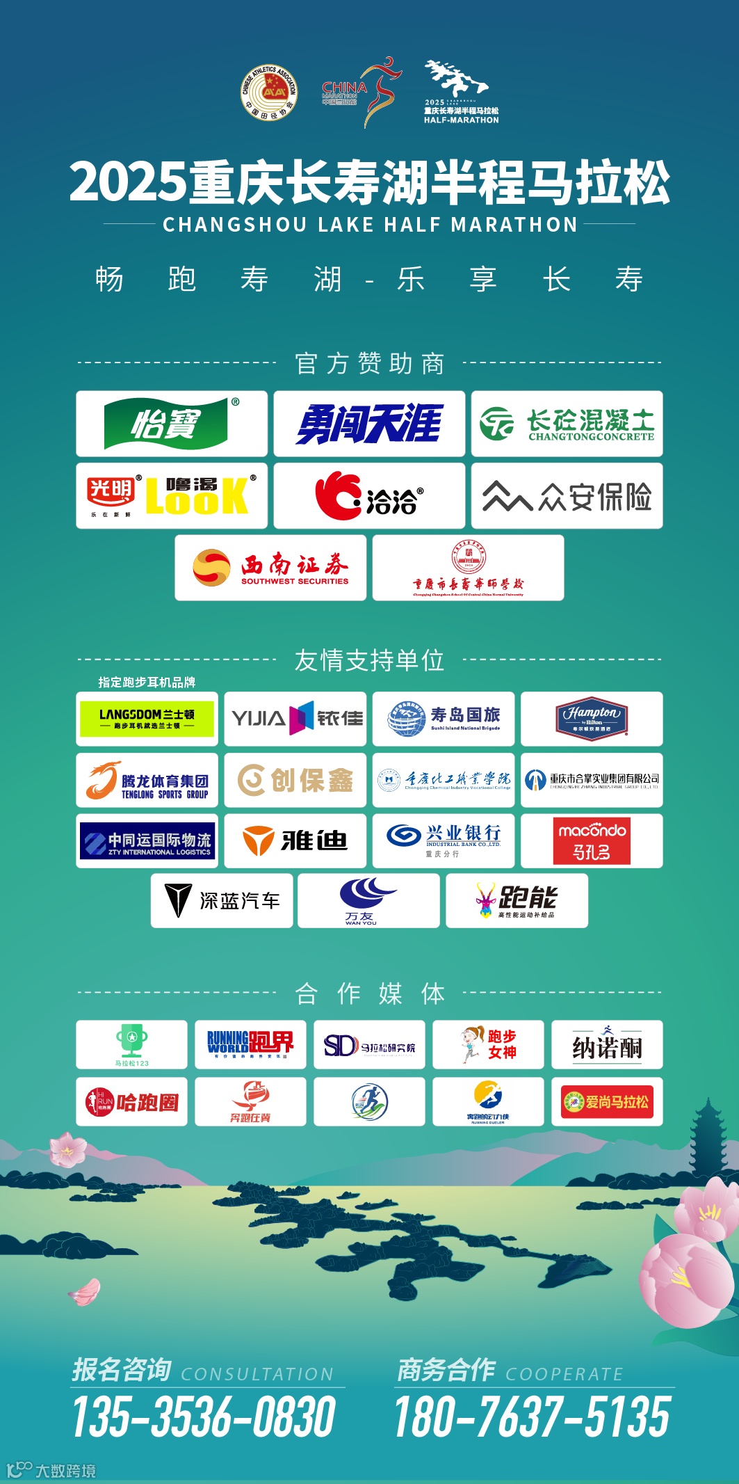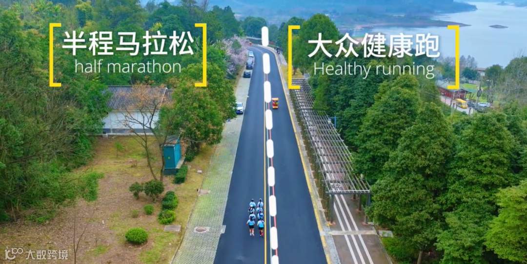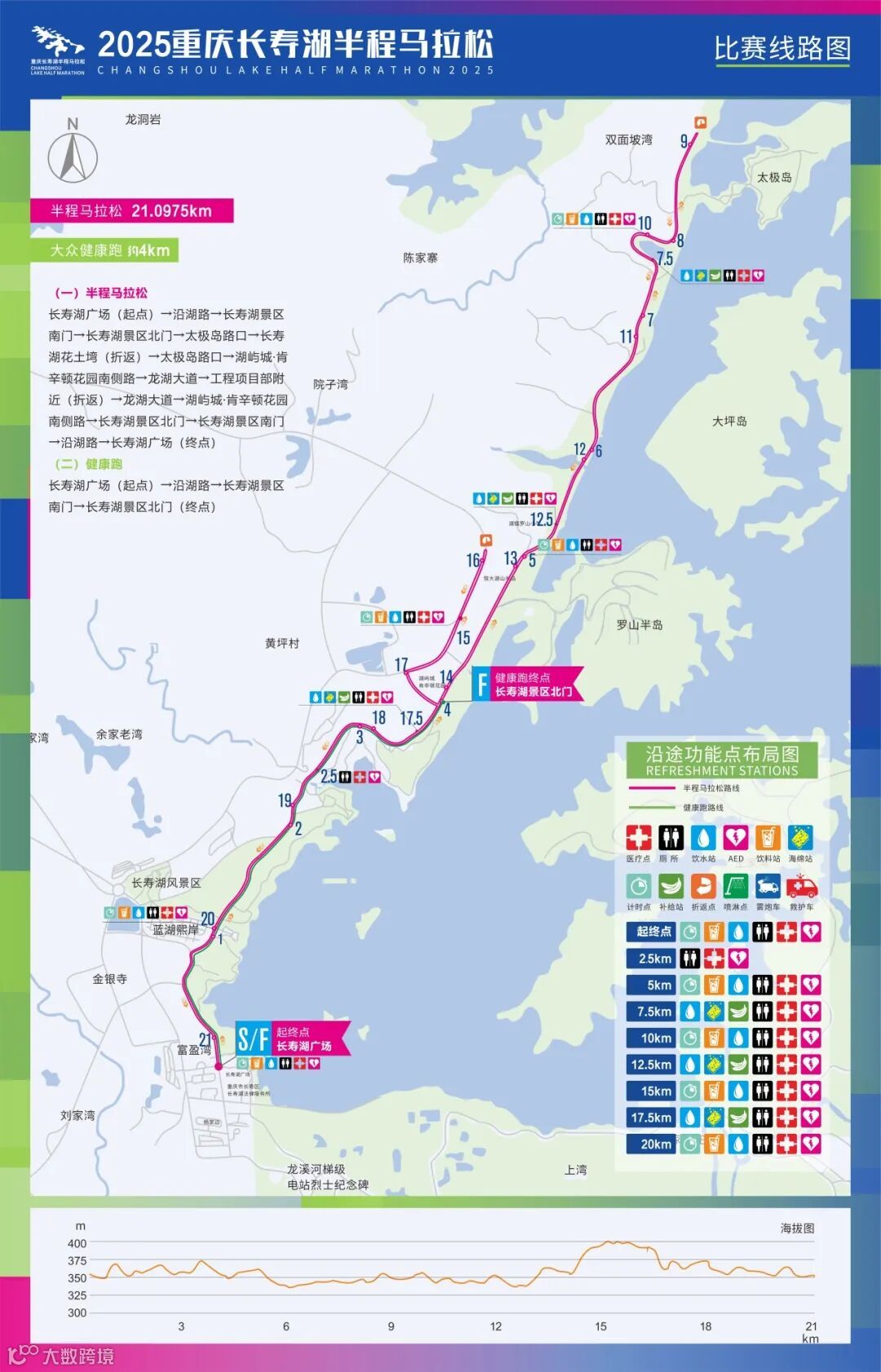 17.6公里处右拐进入长寿湖景区北门,20公里处经过长寿湖景区南门,向南一路跑至长寿湖广场到达终点。