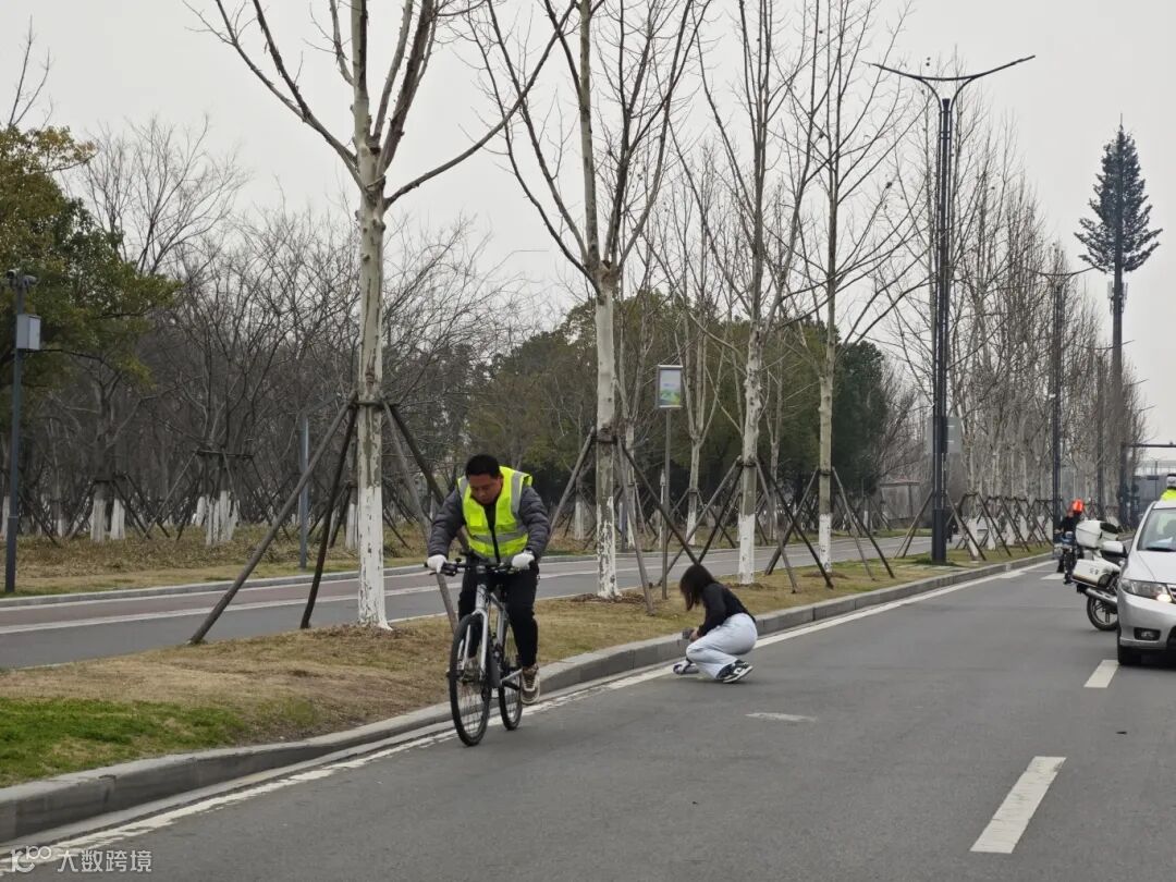 丈量员带领赛道丈量团队从2025枝江女子半程马拉松起点——枝江市体育中心开始,以自行车为交通工具,以计量仪器的数据为支撑,模拟选手最短的跑步路线。测量小组对记录数据进行精准计算,准确地对每公里数和对应位置进行定点、描述。