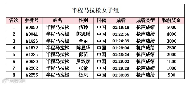 2025枝江女子半程马拉松已于3月30日圆满结束,根据竞赛规程,本次比赛半程马拉松项目名次奖前八名选手按照枪声成绩进行排名,奖励名单如下: