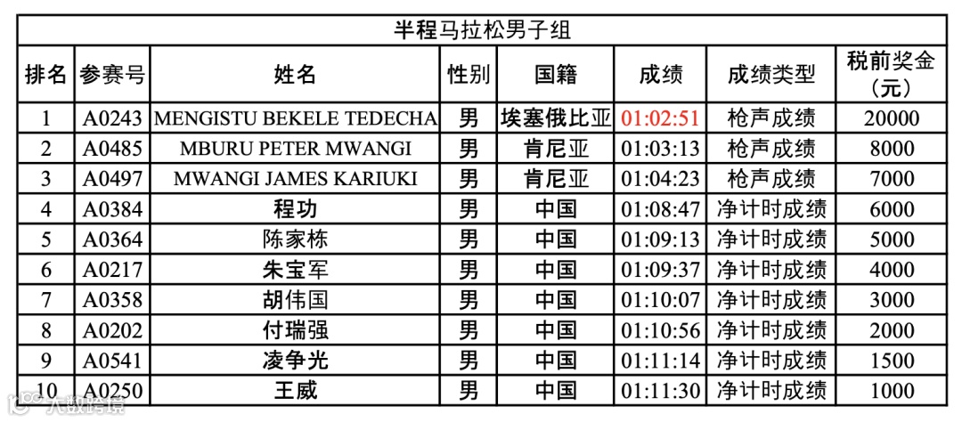 注1:根据竞赛规程,女子成绩1:13:08(不含)以内且第一名,奖励20000元人民币,且破赛会纪录,女子第一名奖金共为30000元人民币。男子成绩1:03:00(不含)以内且第一名,奖励20000元人民币,且破赛会纪录,男子第一名奖金共为30000元。
