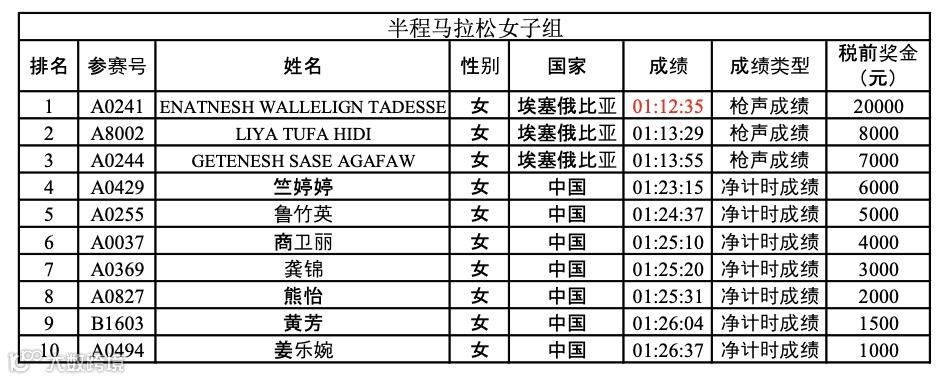 半程马拉松女子组前十