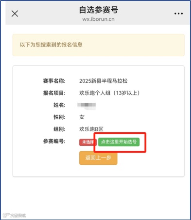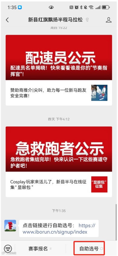 1.扫描下方二维码或关注“新县红旗飘扬半程马拉松”官方公众号,点击“自助选号”。