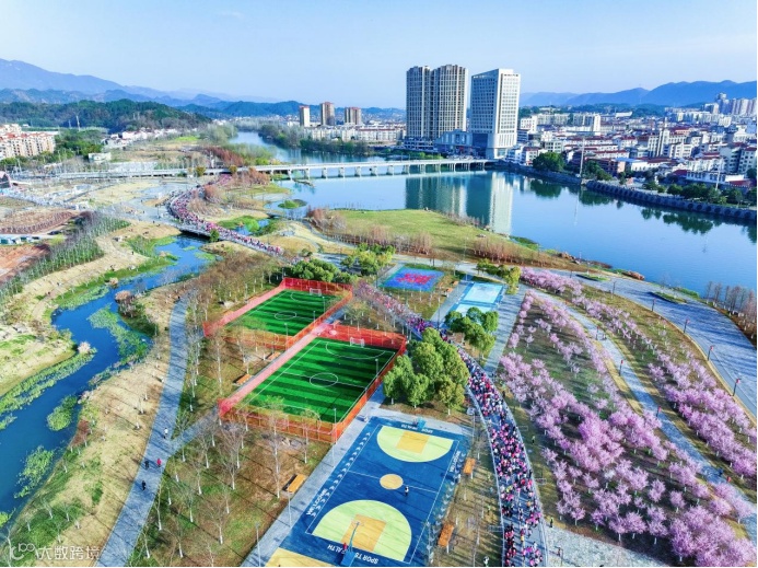 上午8时整,发令枪响,比赛开始!选手们从远安桃花岛生态湿地公园出发,途径桃花渡、双河堰、丹霞岩壁等地标建筑,穿过沮水绿道的村落与油菜花海,沿规定路线奔向终点站。