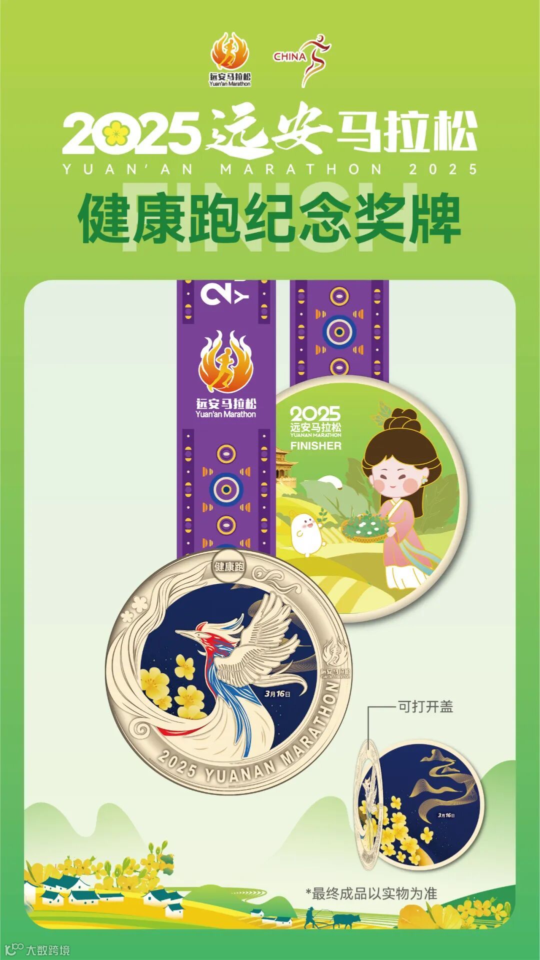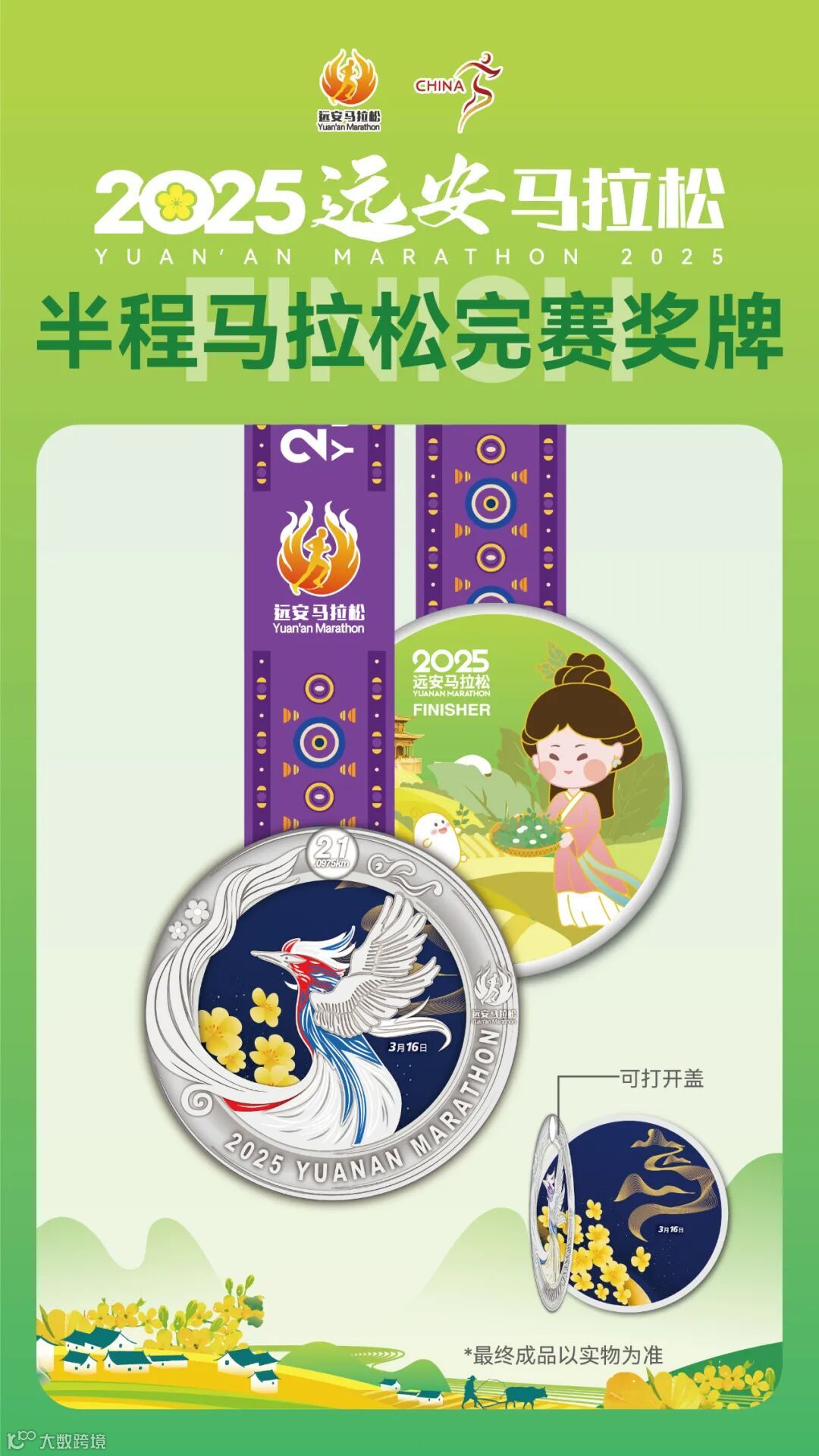 而奖牌的背面则是嫘祖耕织的美丽身影与金色的油菜花海相交叠,这一设计将远安的传统文化与马拉松赛事完美融合。嫘祖耕织的剪影,诉说着远安古老的农耕文明,而代表着跑者身影的金凤则代表着现代的拼搏精神,两者相互映衬,展现了历史与现代的碰撞与交融。