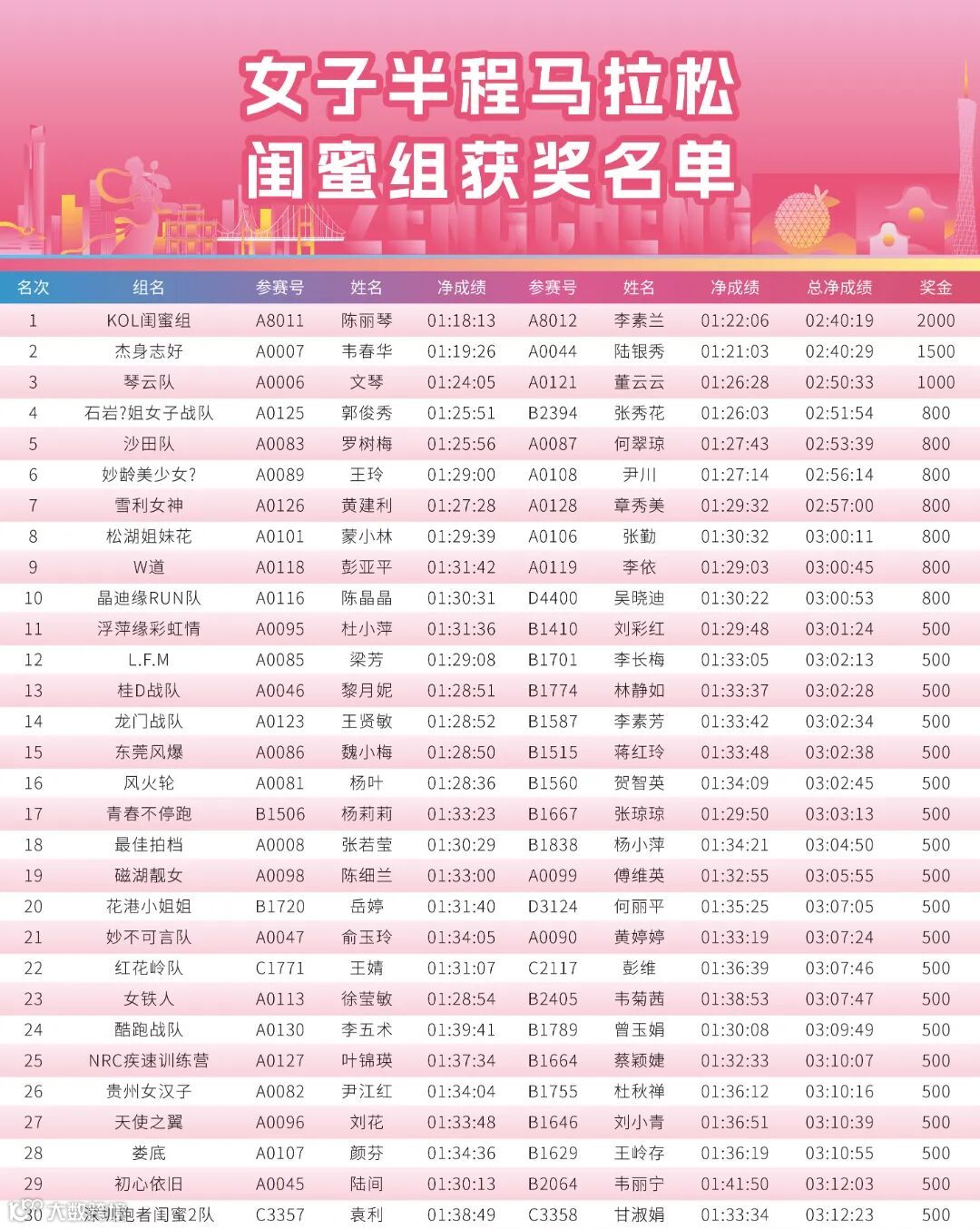 闺蜜组成员仍可参与个人排名,但闺蜜组不可参与女子跑团组排名。 请闺蜜组一人代表本组于2025年1月17日前,扫描下方二维码进行填写相关信息,包括姓名、性别、身份证号码、联系电话、支付宝账号或银行卡账号,上述奖金将按照本次赛事竞赛规程规定,征收20%个人所得税,由粤港澳大湾区女子半程马拉松组委会代收代缴。