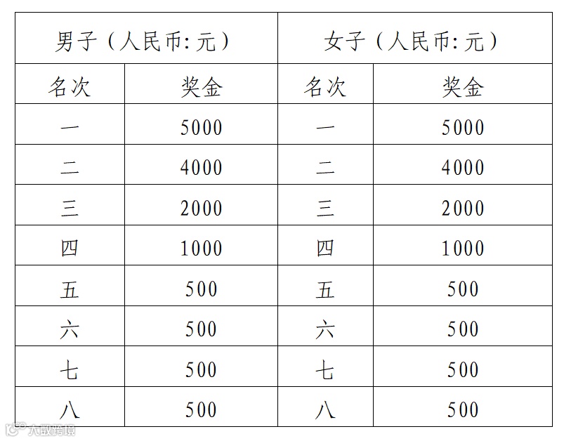 (一)半程马拉松项目名次奖,男女前八名以枪声计时成绩进行排名,具体奖金如下表: