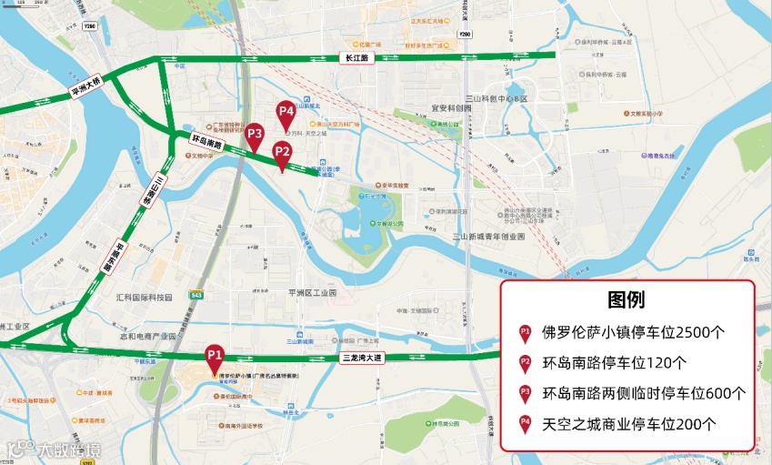 活动场地周边分布停车场有:佛罗伦萨小镇停车场、天空之城商业停车场、环岛南路路侧临时停车区域,共可提供停车泊位约3420个。停车场分布示意图如下: