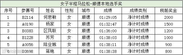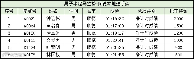 美的·2024顺德半程马拉松于11月10日圆满结束,为激发顺德市民的参赛积极性和自豪感,增设顺德本地选手奖,奖励对象为持有顺德本地身份证或者顺德本地社保卡的市民,奖励男女半程马拉松净计时前六名选手(市民在报名时应选择自己是否为顺德市民,并在赛后配合组委会统一筛选核实)。奖励名单如下: