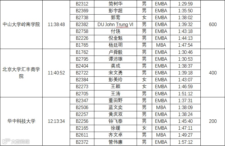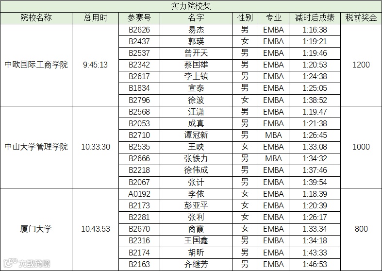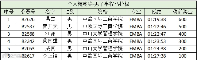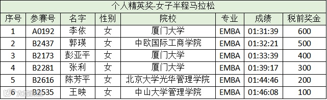 本次商学院赛中赛特设个人奖与实力院校奖,分别奖励男女半程马拉松前六名选手,与实力院校前六名团队,奖励名单如下: