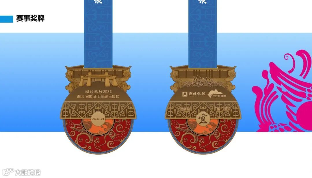 奖牌正面,镌刻着“2024.11.24”,铭记荣耀时刻,赛事主题辉煌呈现;楚国青铜敦龙纹栩栩如生,凤鸟纹灵动环绕,尽显楚文化深厚底蕴与独特韵味。翻转奖牌,背面同样精彩,赛事Logo与各元素交相辉映,360°旋转结构的设计,每一次转动皆如展开宜城文化画卷,让跑者们在领略宜城魅力的同时,也能感受到那份沉甸甸的荣誉感与归属感。
