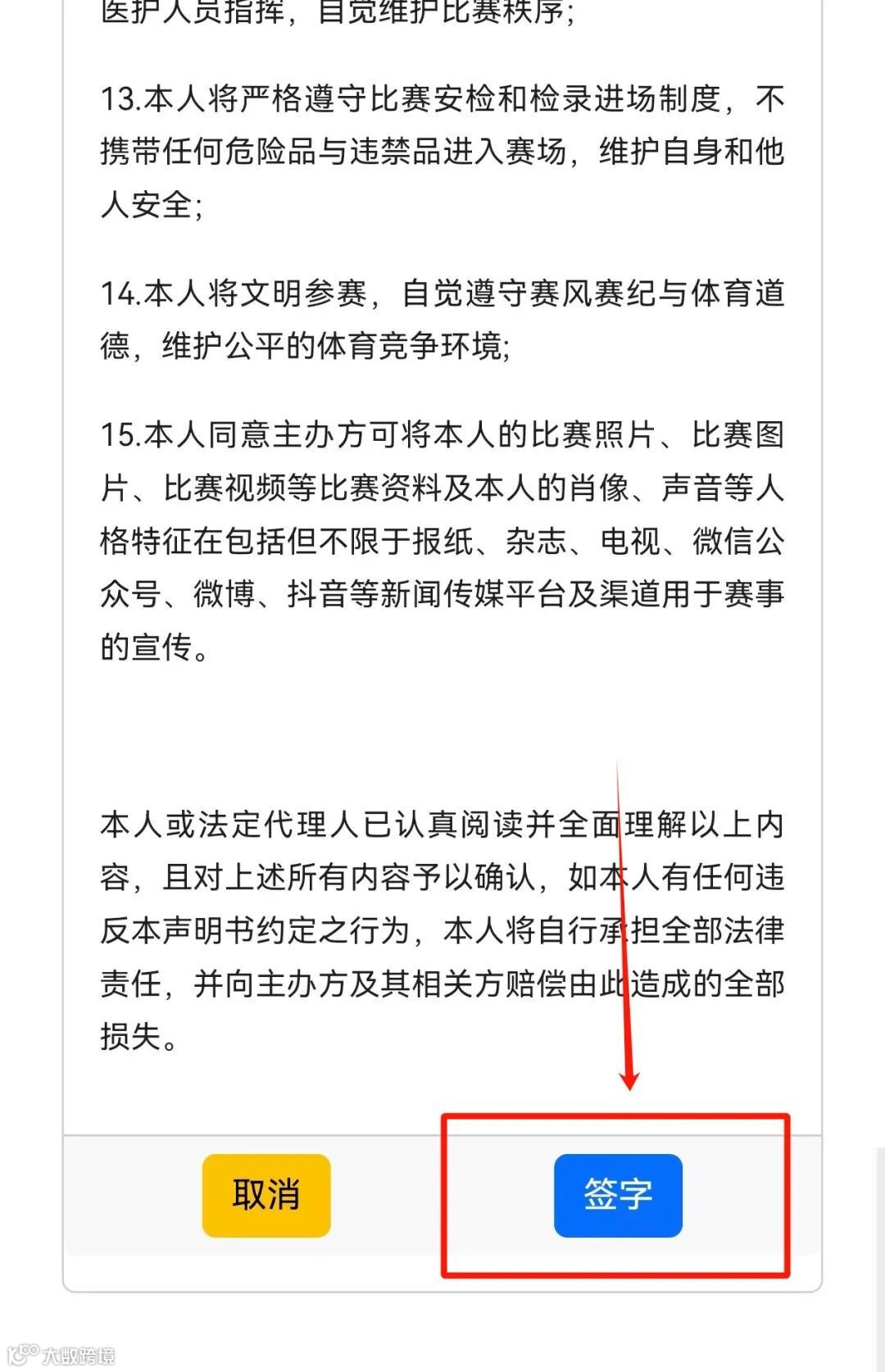 第一步:扫描下方二维码或进入《高邮大运河马拉松》微信公众号→点击最下方选手服务→点击参赛声明→输入证件号→仔细阅读内容后签字,进行线上电子签署后请截图留存。