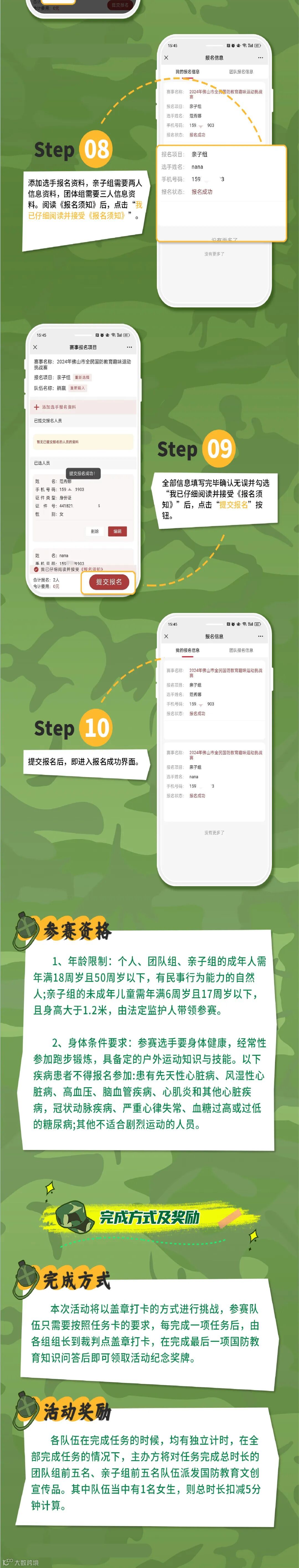 市民可通过扫描专题页面二维码,进入佛山市“全民国防教育月”系列活动专题页面,点击“国防教育趣味运动挑战赛”进入报名页面进行报名。报名费用方面,参赛者可以选择仅支付基础费用,基础费用为9.9元/人,包含饮用水及个人保险。参赛者也可以选择支付包含物料的费用,亲子组(一大一小)费用为98元,团队组(2人同行1人免费)费用为126元,物料包含活动T恤、活动背包、纪念牌、现场饮用水及个人保险。