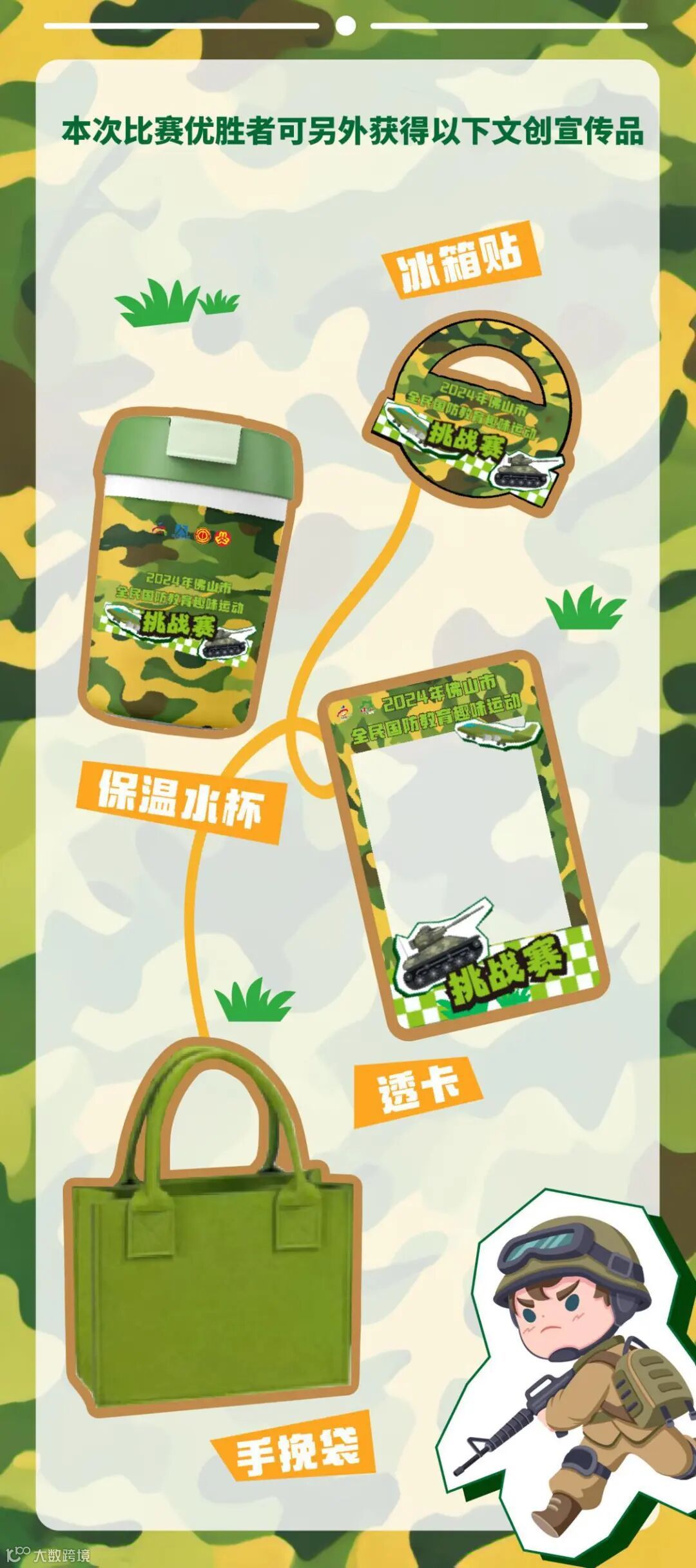 既要克服艰难险阻,怎能少得了充足的战备资源?本次挑战赛,主办方为参赛选手准备了一份超实用的资源包,包括活动T恤、饮用水、活动背包、纪念牌、公众保险等等,保证你在勇往直前时能够获得充足支持!在赛事中获得前5名成绩的队伍,还将获得一份精美的国防教育文创宣传品!等你来拿!