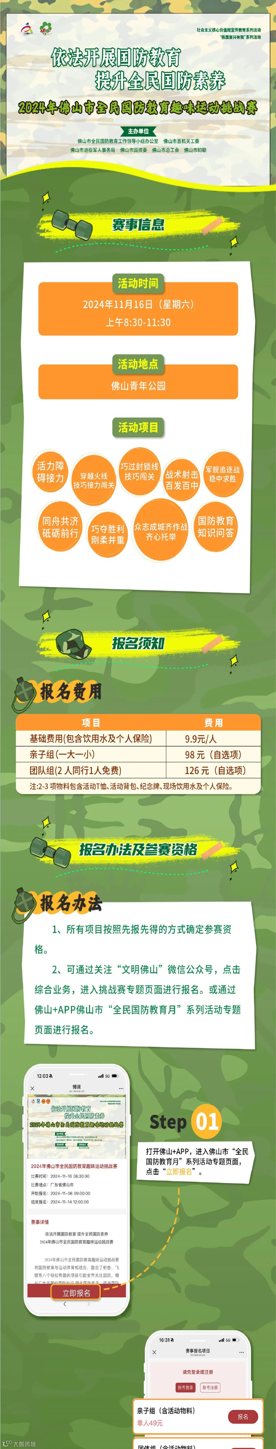 “依法开展国防教育 提升全民国防素养”2024年佛山市全民国防教育趣味运动挑战赛将于11月16日(星期六)上午在佛山青年公园举行。活动轻松有趣、寓教于乐,不仅可以秋日撒欢,亲子同游,还有国防教育文创宣传品等你来拿!名额有限,广大市民朋友们快来报名吧!