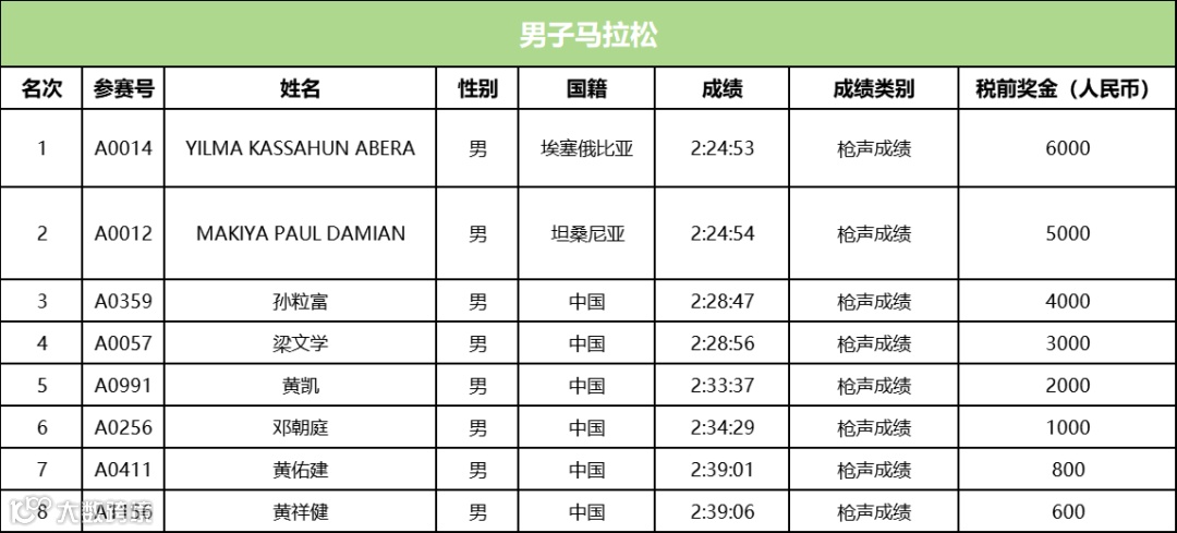 男子前八名成绩根据枪声成绩录取。具体奖励见下表(均为税前奖金,人民币元,需征收个人20%所得税):