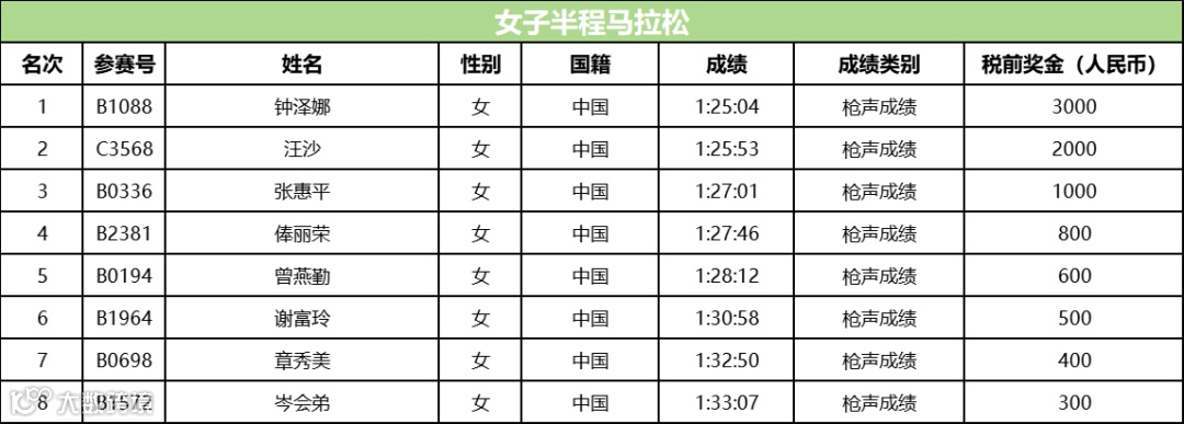 女子前八名成绩根据枪声成绩录取。具体奖励见下表(均为税前奖金,人民币元,需征收个人20%所得税):