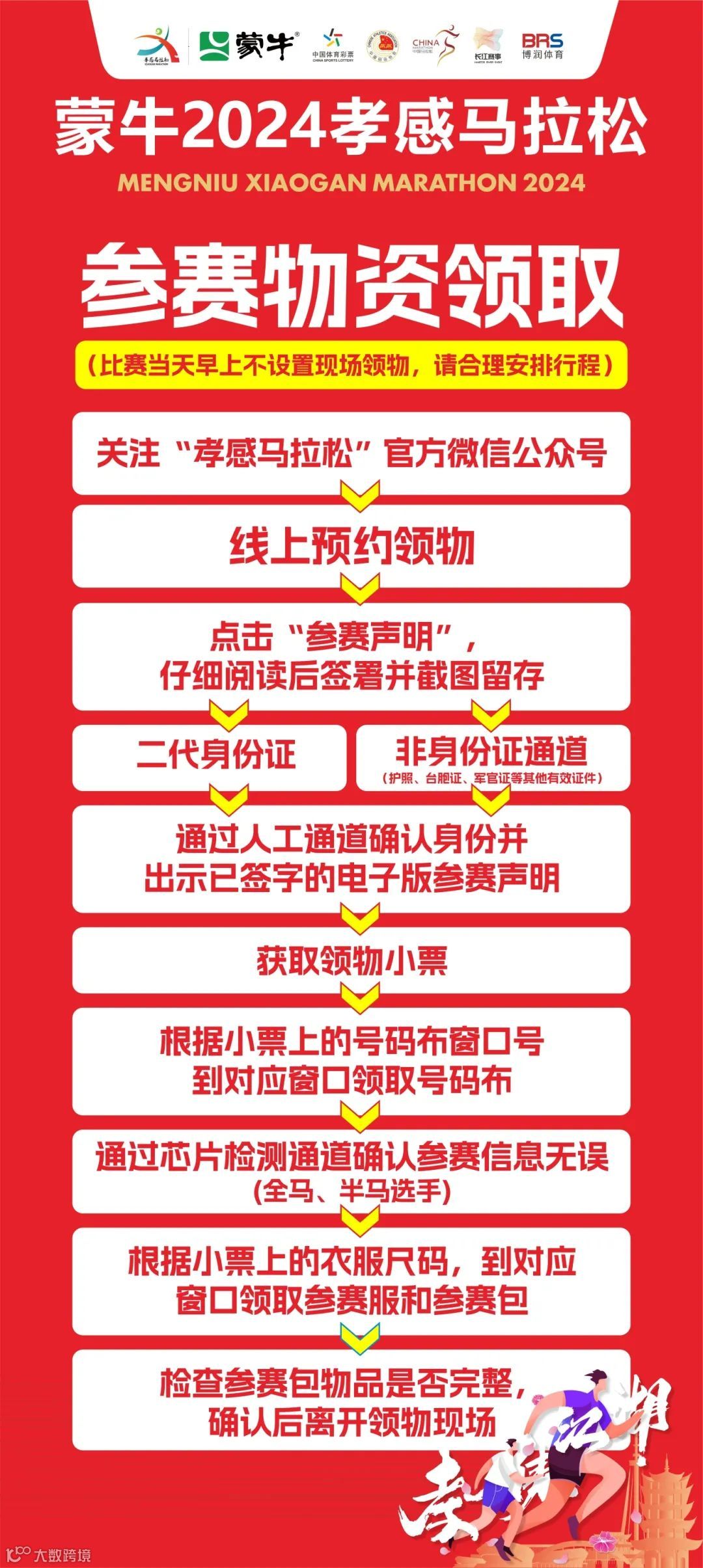 蒙牛2024孝感马拉松领物将采取「分时预约」的方式,严格控制现场的人员规模密度。(先预约,后领物,未预约到场将无法领取参赛物品。)