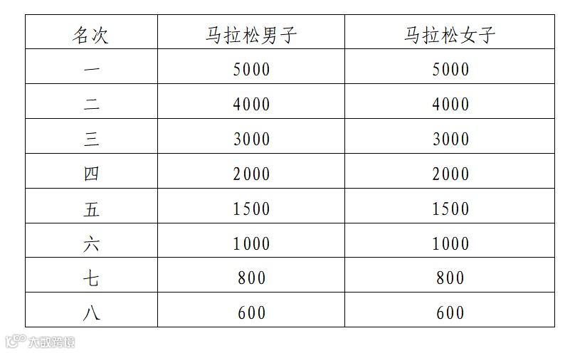 凡参加本次比赛马拉松项目的中国籍选手,录取男子和女子前八名给予奖励,前八名按枪声成绩进行排名。具体奖金如下表(人民币,单位:元):