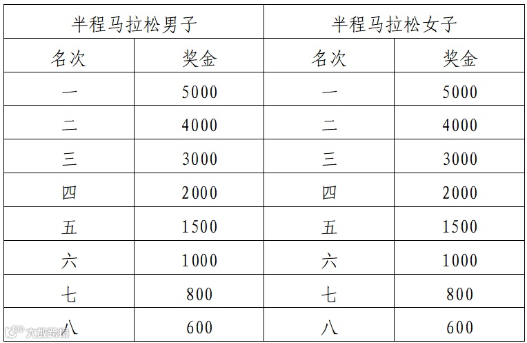 半程马拉松项目按男、女个人前八名进行奖励,按照枪声成绩进行排名;男、女前三名运动员分别颁发奖杯一座、奖牌一枚。具体奖金如下表(人民币,单位:元):