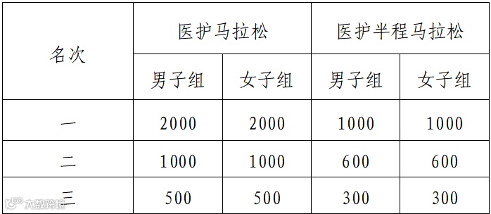 3.“白衣天使”组别的马拉松,半程马拉松名次奖:根据枪声成绩成绩录取男、女前三名运动员。