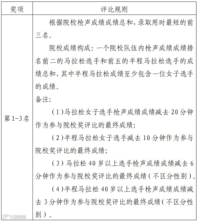 注:若院校队伍内半程马拉松前5名中没有女子选手,则第5人成绩顺延取排名第一的女子选手成绩。若院校总完赛人数不足7名或/和缺少1名女子选手,则无院校成绩;