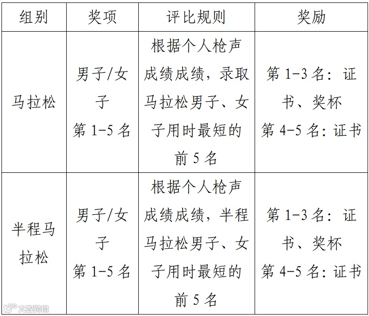马拉松、半程马拉松分别对男子、女子选手进行奖励,包括荣誉证书和奖杯,在成绩公示期结束后发放;