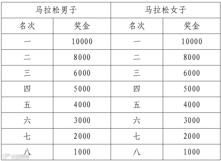 马拉松项目按男、女个人前八名进行奖励,按照枪声成绩进行排名;男、女前三名运动员分别颁发奖杯一座、奖牌一枚。具体奖金如下表(人民币,单位:元):