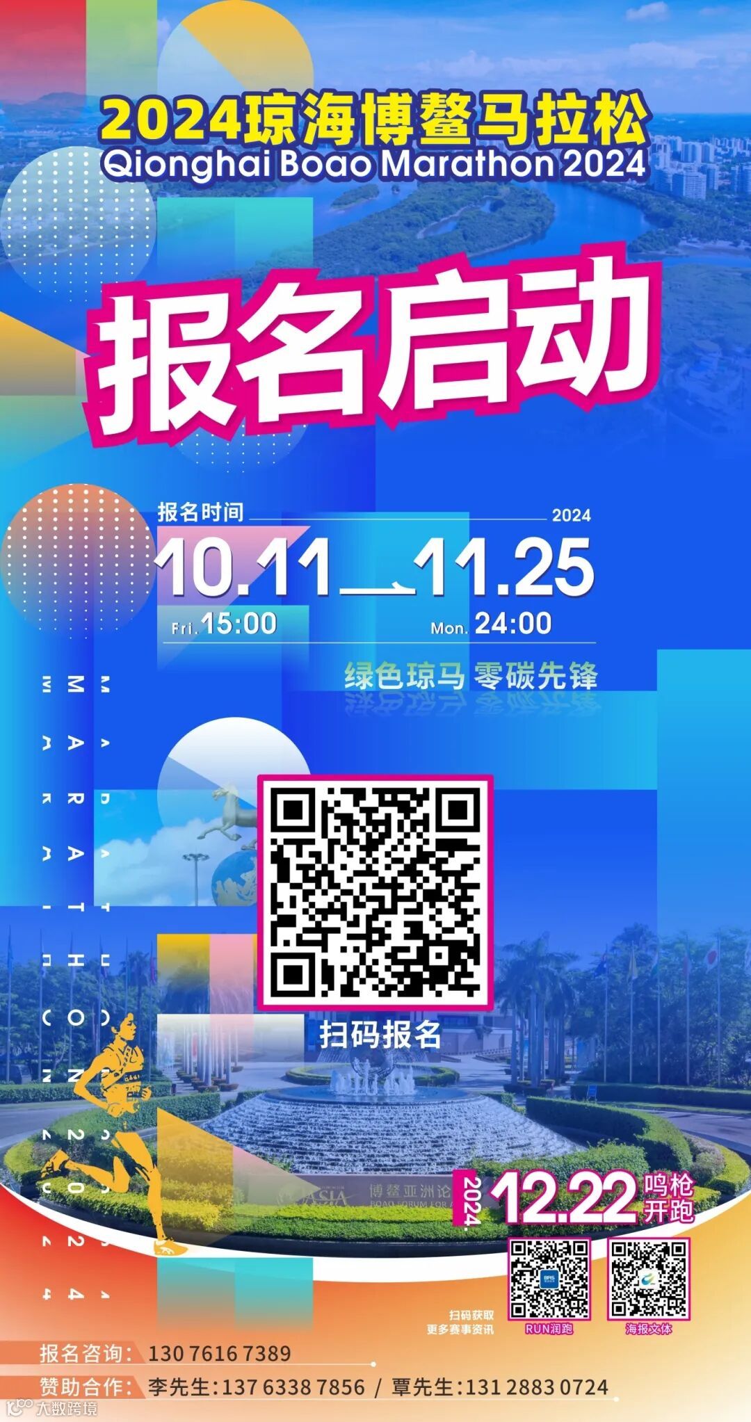 即2024年10月11日15点-11月25日24点,报满即止。选手可登录微信公众号“琼海马拉松”、微信公众号“RUN润跑”“海报文体”或博润体育官网,按照提示流程报名并缴费。
