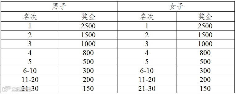 男、女前三十名的选手分别获得奖金(前3名按枪声成绩,4至30名按净计时成绩)。(单位:元)