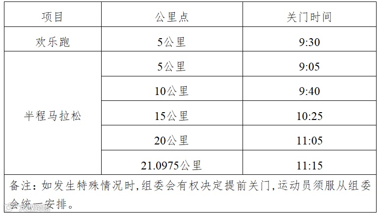 为了保证参赛选手比赛安全,限时对社会交通进行滚动封闭。比赛路线各段专设了赛事关门时间,到了关门时间,相应公里点的计时地毯停止工作,相应路段将恢复社会交通。在规定关门时间内,未跑完对应距离的参赛选手须立即停止比赛,退出赛道,以免发生危险。退出比赛的选手可搭乘沿途的收容车抵达终点或自行选乘公共交通离开。