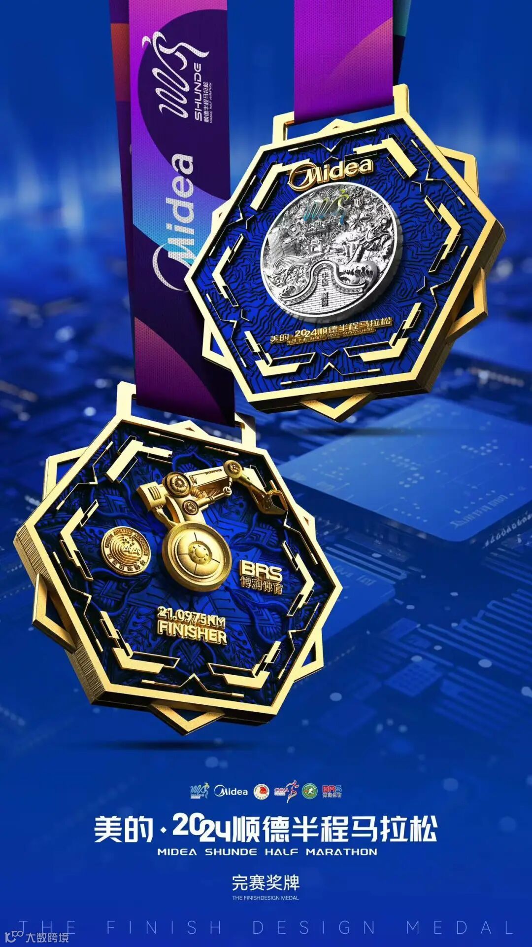 赛事的奖牌主色调以金色镶边搭配蓝色背景,融合了现代感与艺术性,既彰显了赛事的品质,又给人以视觉上的享受。奖牌正面上方是本届赛事总冠名商美的集团Logo,底部为赛事全称,中心位置则巧妙融入了顺德多个地标元素。