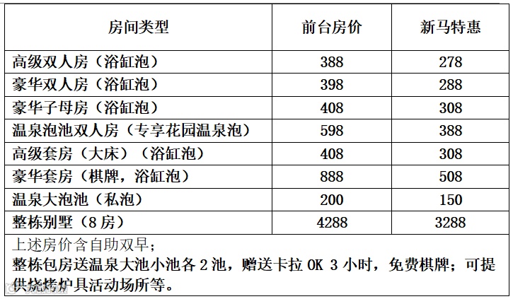 优惠措施:标准双人房平日338元/间,周六368元/间。行政大床房平日638元间,周六708元间,家庭套房平日1088元间,周六1188元间,一居别墅平日818元间,周六918元间,二居别墅平日1438元间,周六1538元间,三居豪华别墅平日2488元间,周六2638元间,三居独栋平日2588元间,周六2738元间,四居别墅平日3138元间,周六3288元间。可延迟至下午2:30退房。
