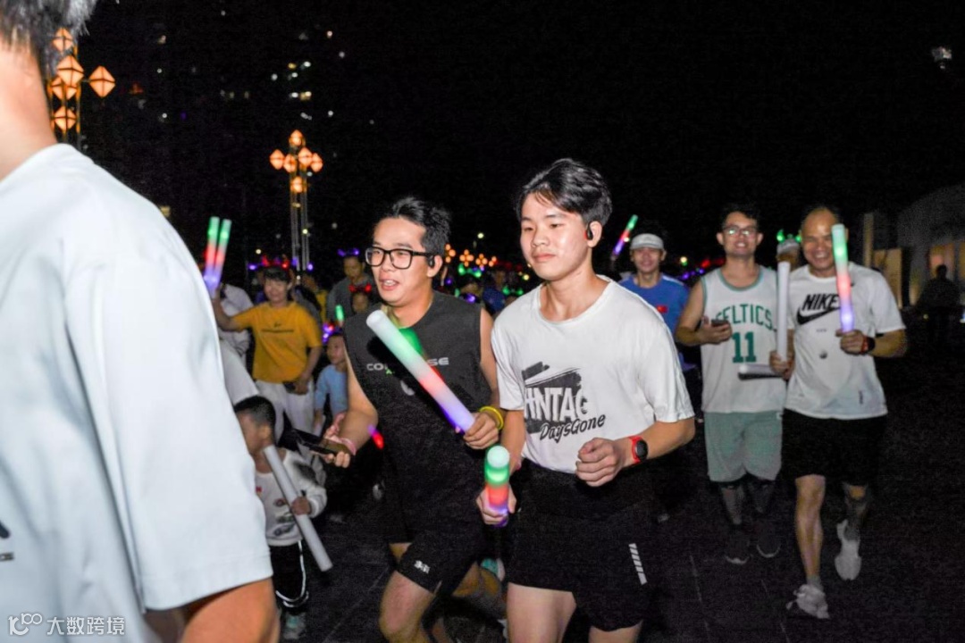 在灯光璀璨的夜色中,跑友们迈开脚步,迎着温柔的晚风,轻快地穿梭于城市之间,尽情领略着云浮的夜色美景。荧光棒与夜色共同构成一幅流动的光影画卷,点亮夜晚气氛。大家一起携手营造热烈赛事氛围,在荧光下共绘激情画卷,在夜的璀璨中,共赴赛事前的荣耀热身!