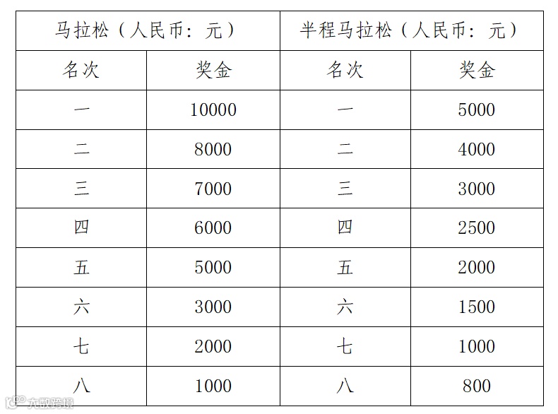 马拉松项目名次奖的男女前八名按照枪声成绩进行排名,半程马拉松项目按照净计时成绩录取名次,具体奖金如下表: