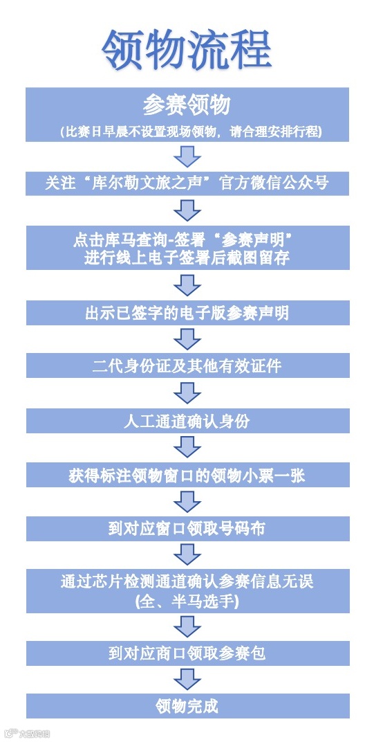 1.领物前请核对好领物资料,提前签好电子版《参赛声明》,并携带好报名时所用的有效证件原件前往领物现场(鸿雁广场)领取物资。
